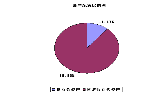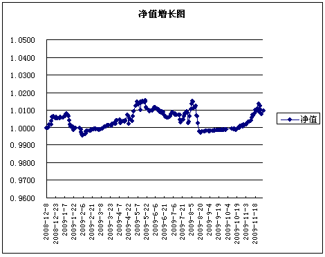 10月份的经济数据显示,工业生产继续加快,固定资产投资继续维持30%以上的高位,社会消费品零售总额增速明显提升,经济同比数据继续呈现出向好的态势。但总体来说并没有超出市场预期。 9月份CPI降幅比上月收窄0.4%,连续第二个月收窄;PPI降幅比上月收窄0.9%,降幅比CPI收窄幅度大0.5%。人民银行 10月 14日 公布的9月份金融运行数据显示,9月份金融机构人民币新增贷款5167亿元,超过此前市场普遍预期的4000亿元的规模。从贷款结构上看,国有大型银行的贷款明显收紧,而中小型股份制银行成为贷款发放的主力。根据“大银行服务大客户,小银行服务小客户”的特点,当前新增贷款规模的加大很有可能预示着民间投资已经启动,经济复苏将从政府拉动向民间自发的良性循环转变。 10月份出口额为1107.6亿美元,同比下降13.8%,较9月份收窄1.4个百分点,降幅继续缩小,为今年最低降幅,显示出在全球经济回暖的大背景下,我国出口形势开始有所转好。 11 月25日 ,迪拜最大的国有企业迪拜世界和其子公司Nakheel宣布推迟偿还债务,引发全球债务违约忧虑,不过此事件对全球的影响可能会有惊无险。我们认为,一方面“迪拜事件”对全球复苏带来“雷曼冲击”的可能性较小;另一方面“迪拜事件”显示银行系统的经营压力将持续存在,这对于决策层而言是考虑政策退出时机的重要因素。 n 债券市场 11月债券市场回暖,主要因为:一是资金面宽裕;二是央票利率迟迟不变化,稳定市场的预期;三是10月份宏观数据特别是信贷和投资数据低于市场预期,修正对经济的乐观预期。从收益率变化情况看,中长期国债表现较好,金融债表现较差,主要是因为供给压力比较大。 n 股票市场 11月A股主要市场呈现强弱分化格局,中小企业板月度涨幅达到8.94%,深圳A股月度涨幅为7.66%,强于整体A股3.86%的涨幅,上证50、上证180、沪深300和上证A股指数月度涨幅居后,其中上证50还出现了下跌,月度表现弱于整体A股,显示市场在11月份的反弹过程中,中小市值的深圳A股整体表现要强于蓝筹股板块。 与10月相比,11月整体行业PE结构变化较大,PE在20倍以下的行业有2个。而30倍以上的高估值行业由10月份的18个减少到11月份的16个,另外PE在20倍-30倍之间行业数增加到5个。有色金属PE最高,为88.36倍,信息服务PE最低为18.23倍。 操作回顾 债券投资方面,本月主要操作是维持组合久期和产品到期日相匹配,积极进行新股、新转债的申购。 股票投资方面,本月重点布局的行业主要有二三线地产、家电、食品饮料等板块,积累了一定的保本垫。 同时,我们也积极参与新股申购,获得无风险收益。 截至2009年11月底,本理财产品信托账户资产净值合计为51856万元,资产单位净值为1.0097元,收益率为0.94%。 在大类资产配置中,权益类资产市值为44,375,876.90元,占净值比重为11.1658%;固定收益类资产市值为353,051,267.00元,占净值比重88.8342%。