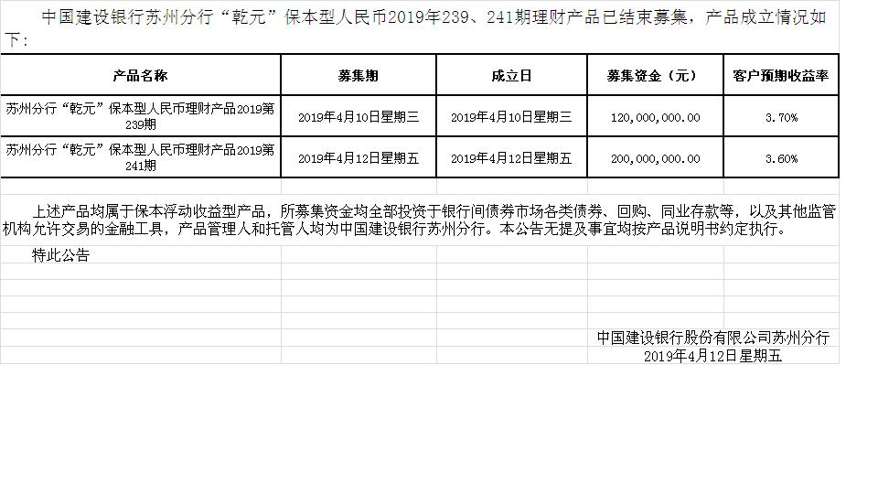 中国建设银行苏州分行“乾元”保本型人民币2019年239、241期理财产品成立公告
